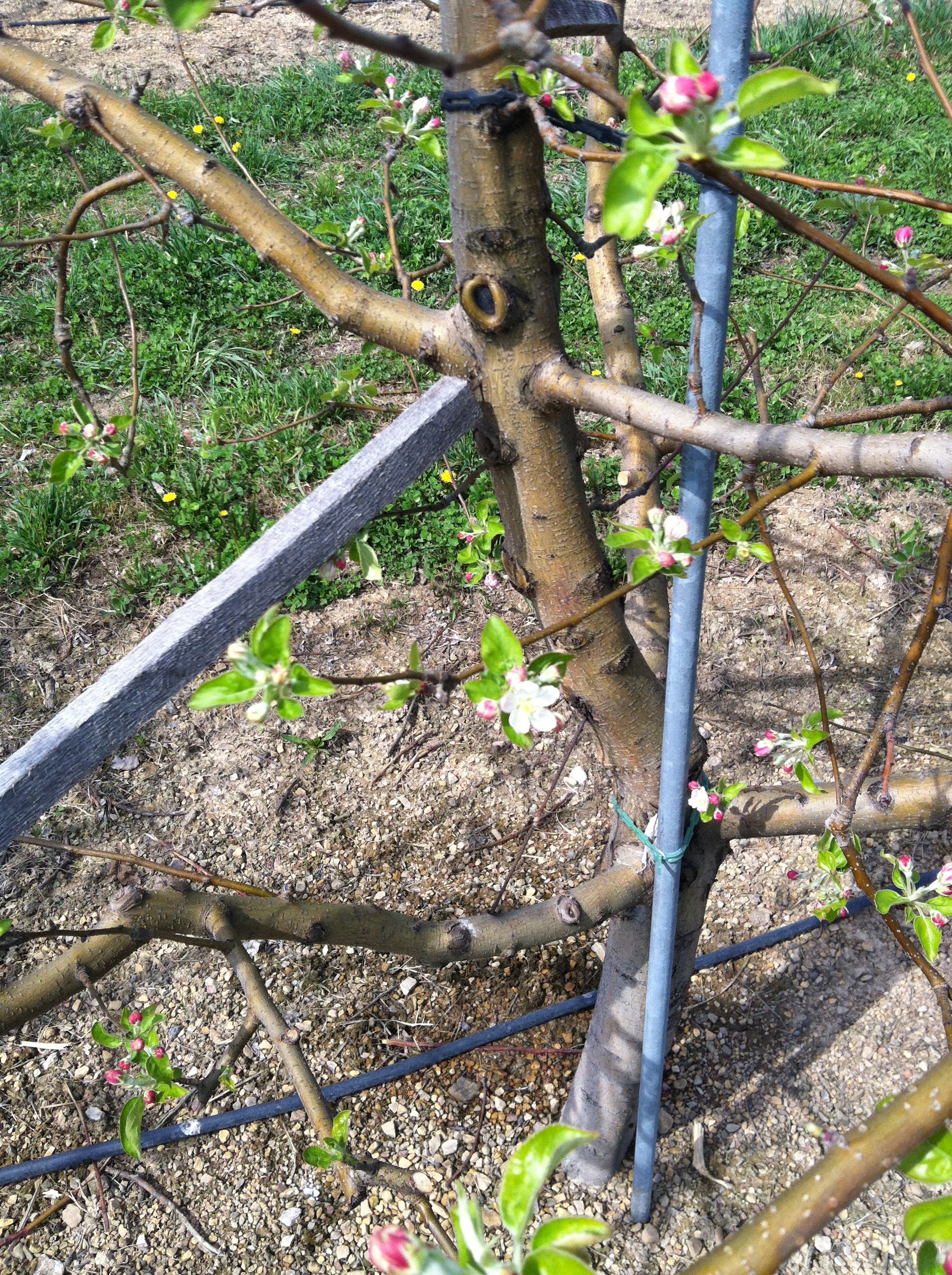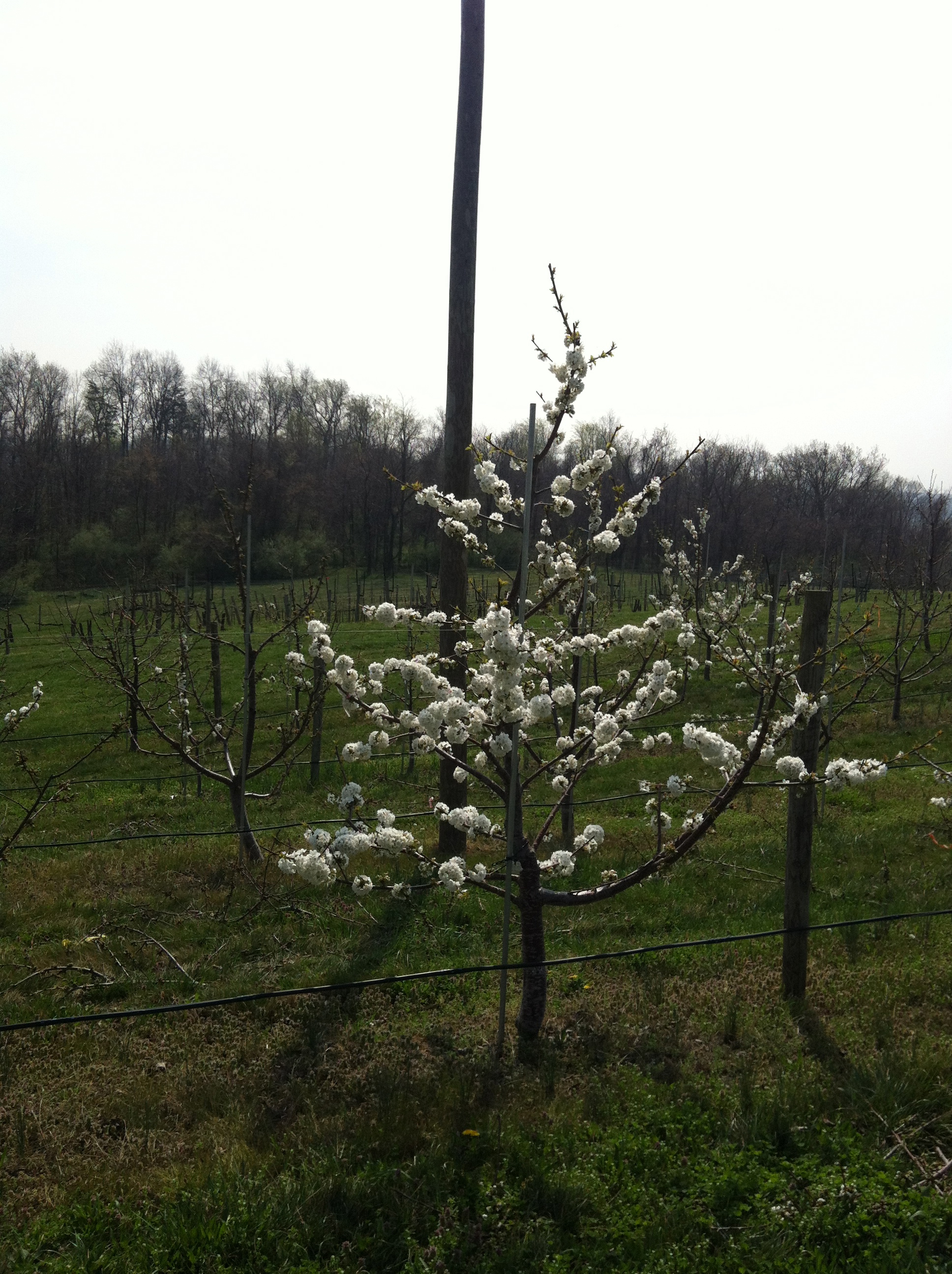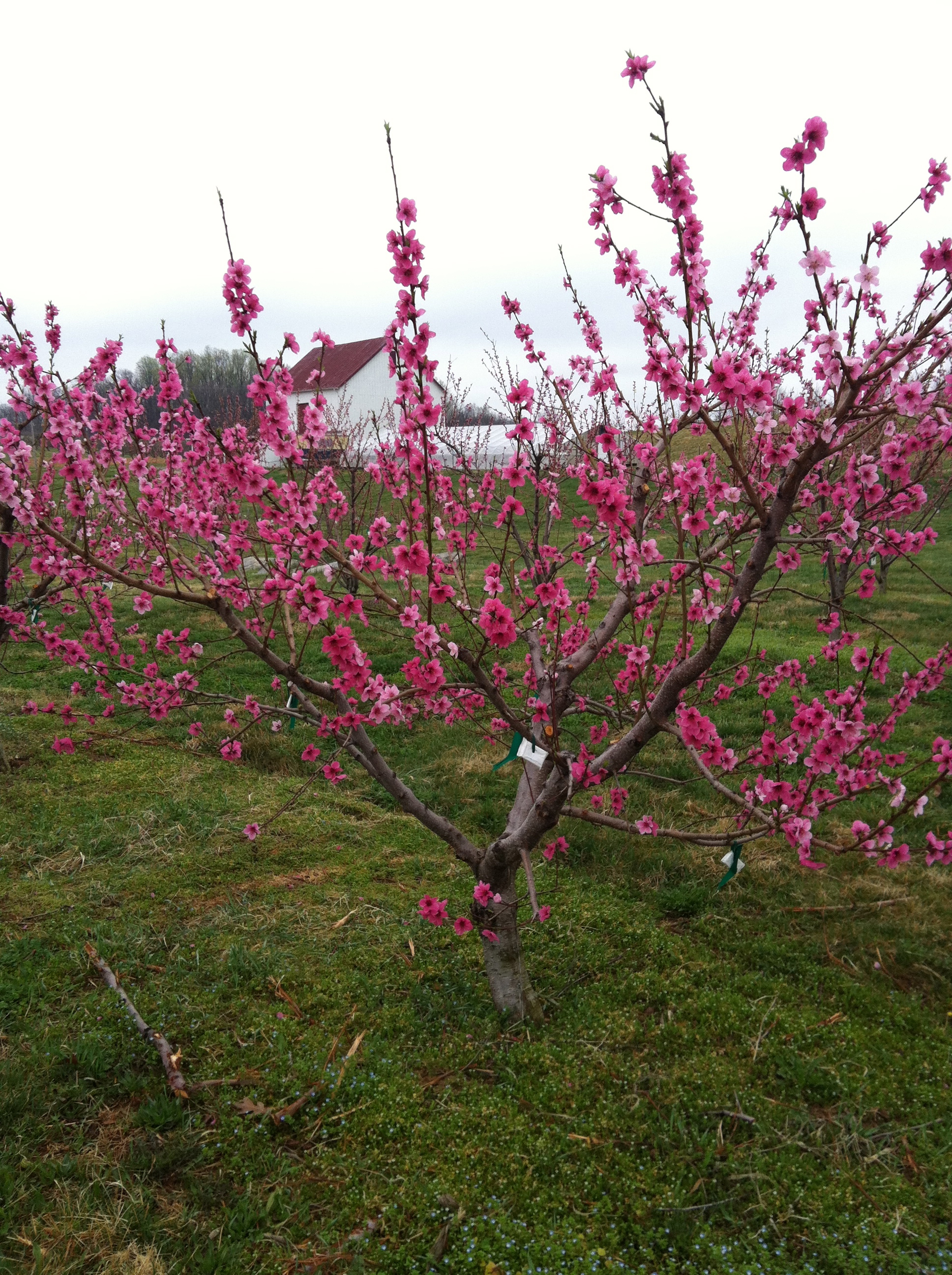 We are easily three, and maybe four weeks ahead of “average” bloom dates in the Winchester area. Apples flower buds are ranging from tight cluster (Fuji) to open cluster (Red Delicious) to about 10% bloom open (Pink Lady). Peaches are at full bloom to petal fall. Cherries are at first bloom.