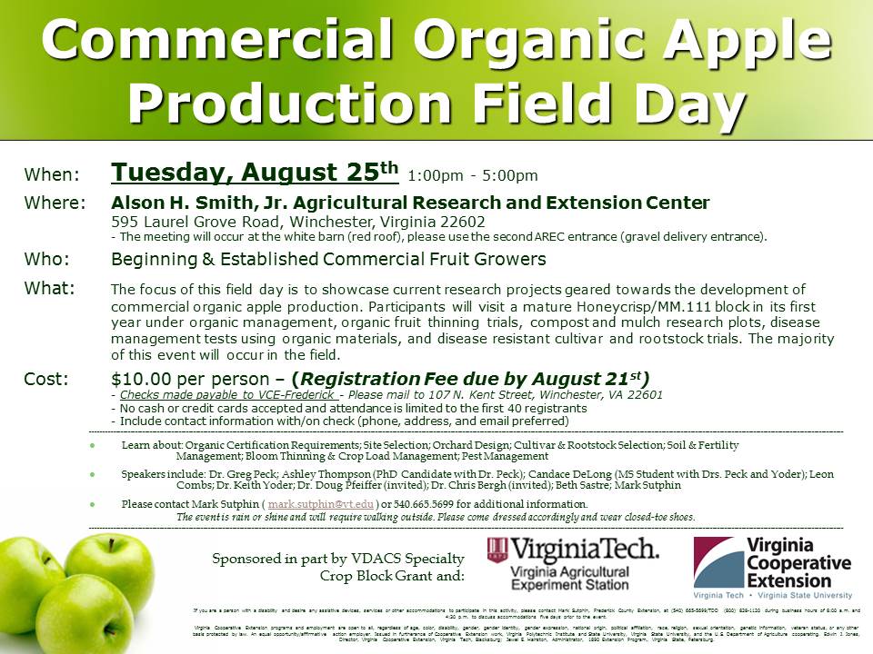 We are holding a Commercial Organic Apple Production Field Day at the Alson H. Smith, Jr., Agricultural Research and Extension Center in Winchester, VA on Tuesday, August 25th. Further details and registration instructions can be found on the Organic Apple Production Field Day 8-25-15 flyer.
