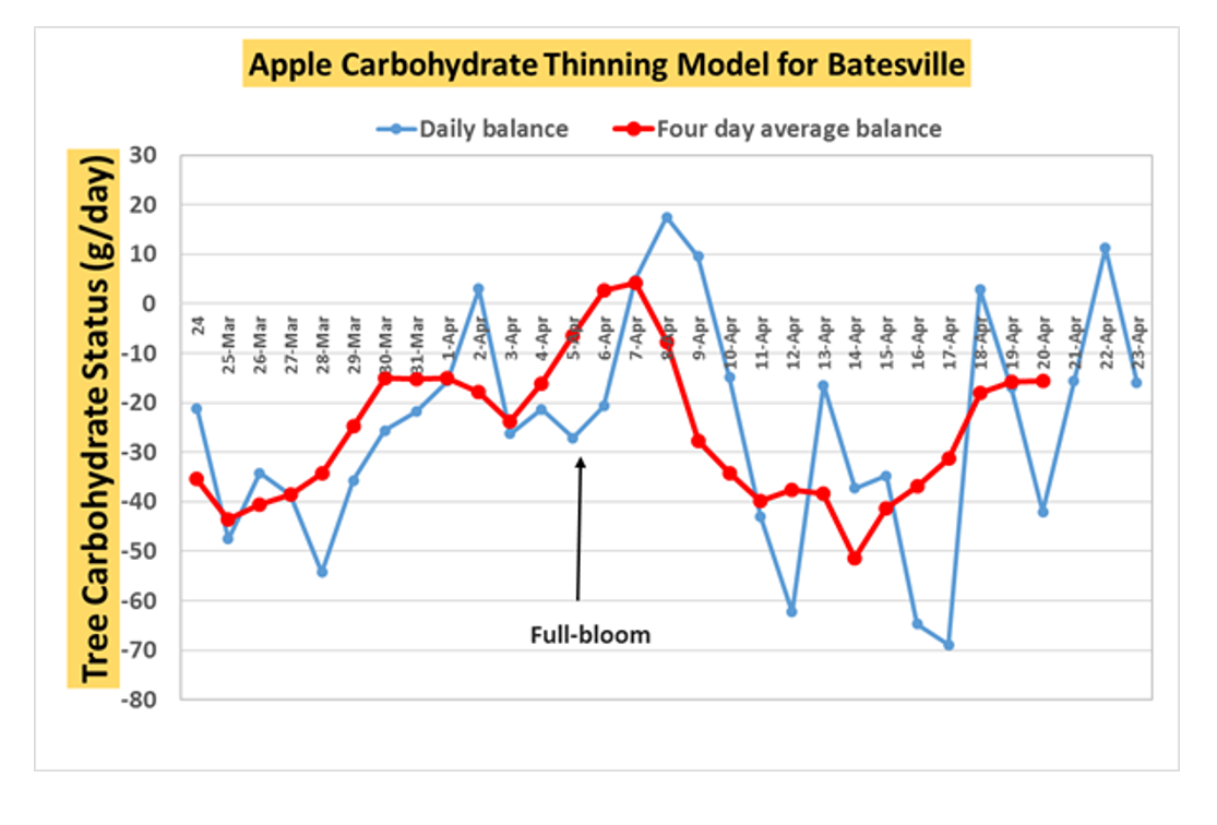 The outputs of the carbohydrate model for Central Virginia area is based on the Batesville (Crown Orchard) weather station. The solar radiation and temperature values suggest carbohydrate deficiency through this week (until Friday, April 21). Since it’s rainy today in most parts, thinning applications (at the standard rate) tomorrow and till Friday should be efficient. Although it will be sunny and warm tomorrow and probably Saturday, leading to some carbohydrate accumulation (the blue line), interruptions with hot and/or cloudy days will reduce the 4-day average (red line) balance and promote fruit abscission.