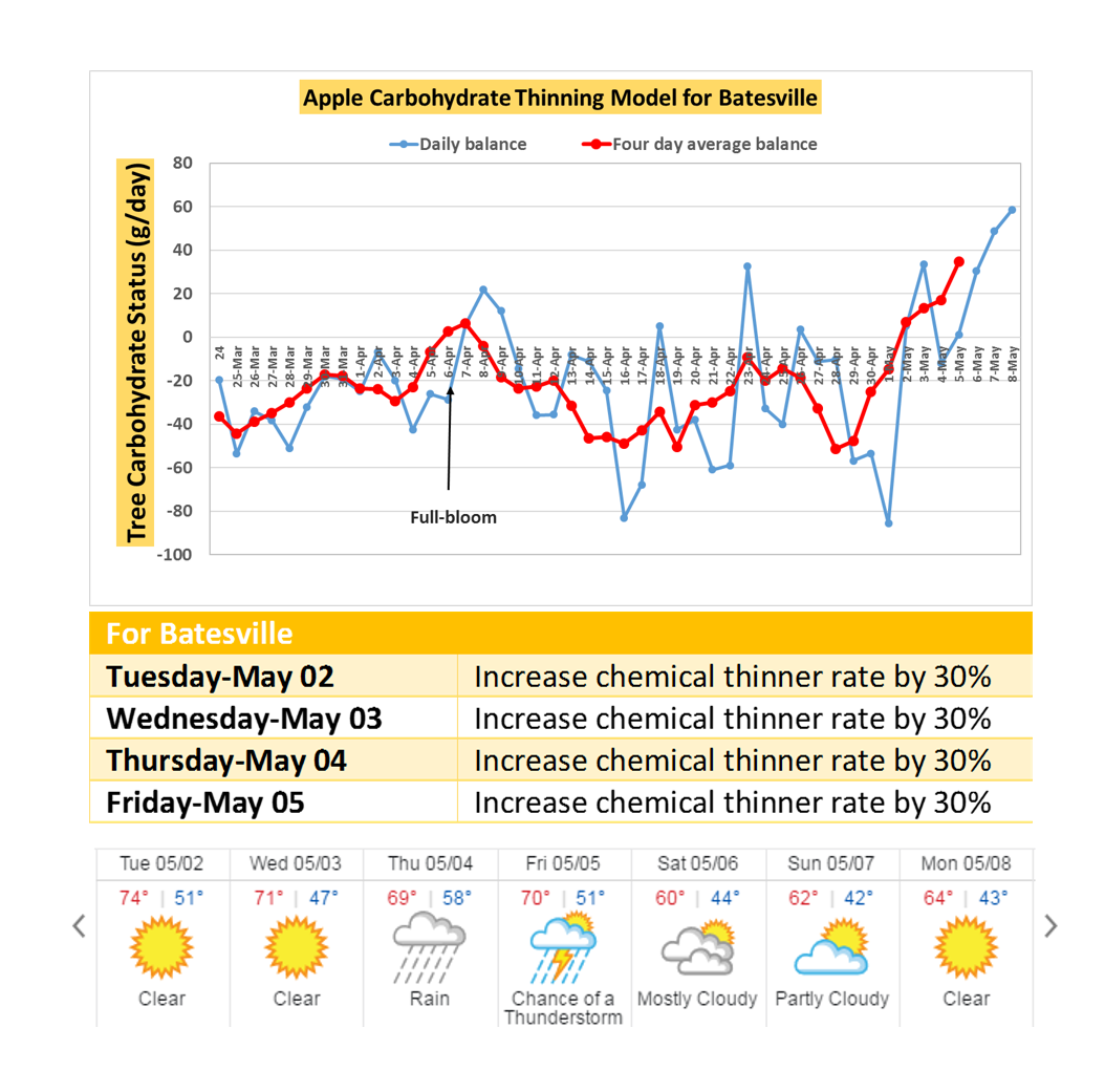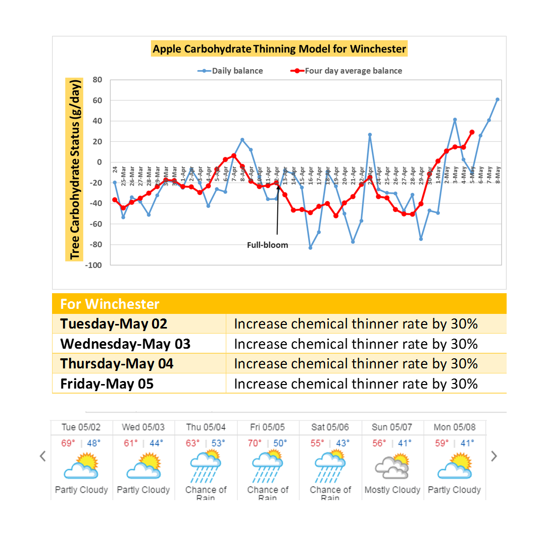 Unlike last week, weather forecast predicts conditions that will likely lead to carbohydrate surplus and subsequently, less thinning efficiency this week (May 01-05). As shown in the images below, the carbohydrate model predicts accumulation of up to 35g/day carbohydrate this Friday. This, in turn, will necessitate a 30% increase in the rate of chemical thinners that will be applied tomorrow, Thursday or Friday. I believe we are still within the good thinning window in terms of fruit size, but this week might be the last chance for (6-BA + Carbaryl), or (NAA + Carbaryl) sprays to show an effect.