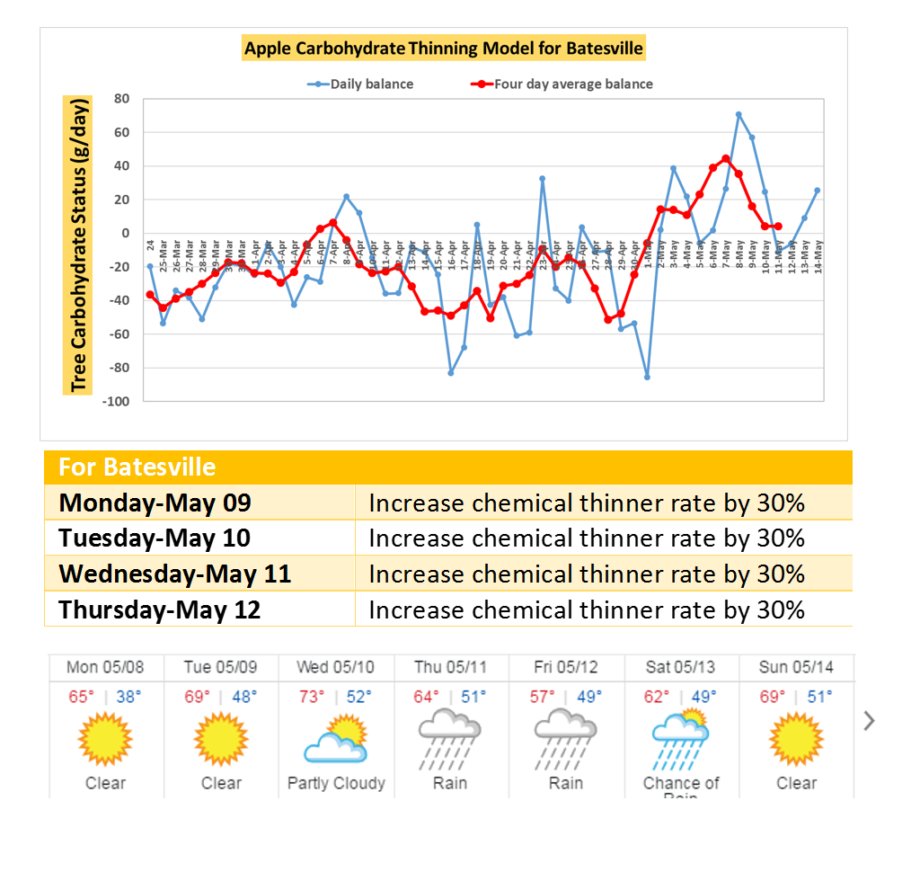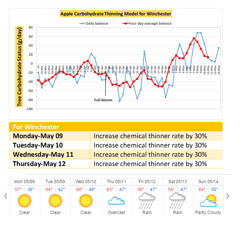 As shown in the graphs below, the apple carbohydrate-thinning model predicts carbohydrate surplus for the whole week and likely during the weekend in Winchester and Central Virginia. Under such conditions, the recommendations are to increase the rate of chemical thinners by 30%.