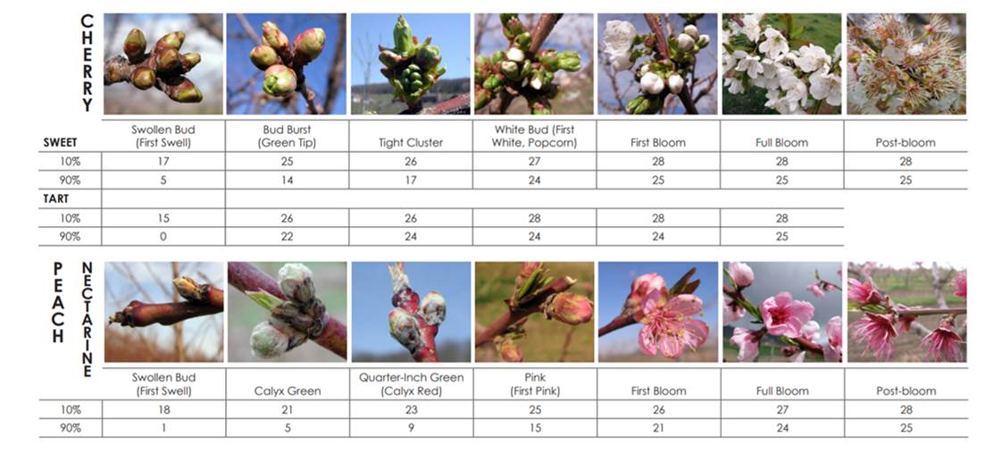 As you may be aware, temperature are going to drop to a freezing point (32 oF) tonight and tomorrow night in most parts of Virginia (see the freeze warning: http://www.fox5dc.com/weather/freeze-warning_62343395). Most peach and cherry varieties are in full bloom now and this weather might cause a slight damage to the open blossoms, but we are not close to the critical temperatures that would cause serious damage to the crop. Here is the chart of critical temperatures for frost damage.