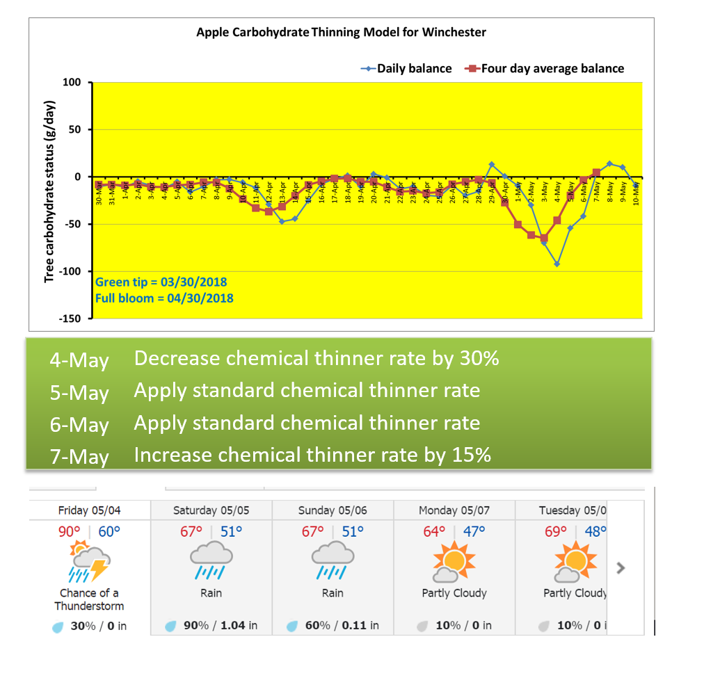 “The apple carbohydrate model simulates the response to weather of trees that are healthy with normal vigor and bloom, no significant water, nutrient or winter or spring freeze stress, and no significant carry-over stress from a previous year that will change tree responses. We are less confident in the model if temperatures are extremely cold or hot. Each orchard is unique, so use this tool, as any other, in the context of your own experience”
