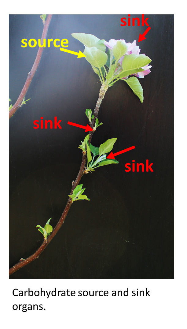 Beside the temperature and solar radiation, the percentage of the source to sink organs also determines the tree carbohydrate balance, and subsequently the response to chemical thinners. Therefore, in the chart above, you will notice a carbohydrate deficit in the last five days despite the sunny weather. This is mainly due to two reasons: a) temperatures were high (> 88 oF) which encourages photorespiration, not photosynthesis; b) the demand of sink organs (i.e. flowers, young fruit, young leaves, buds) to carbohydrate is higher than what source organs (i.e. mature leaves) can provide at this stage (see the figure below). This balance between sink to source organs will change as leaves mature, and the competition among sink organs decreases.