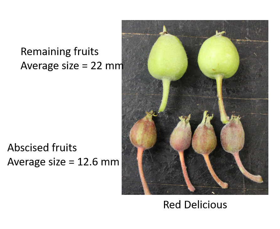 Although this is the time of the year we usually talk about rescue thinning treatments, this might not be necessary this year. The several days of cloudy and rainy weather last week (April 13-18) had resulted in natural fruit abscission in many varieties. Although the carbohydrate thinning model did not predict any natural abscission to occur, it showed a severe carbohydrate deficit in the last ten days. Today I was examining some apple blocks in our research farm, and I noticed a lot of apple fruitlets under the un-thinned trees. The size of abscised fruit ranged between 11.1 mm in Gala to 13.6 mm in York (see the figure below). Although this predicts over-thinning in blocks sprayed with chemical thinners early last week, it could be just fine with some varieties like Fuji where chemical thinning is not always effective. If natural fruit abscission or over-thinning is the case in your blocks, it might be wise to reduce the number/amount of return bloom applications as this might result in excessive blooming next season.