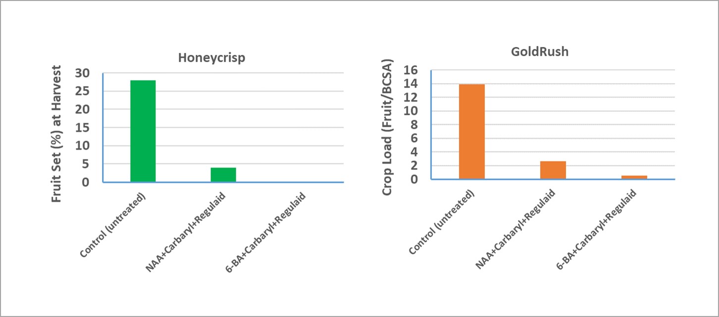 The following figure shows the effect of two defruting treatments on fruit set (%) and crop load (fruit/branch cross-sectional area) of Honeycrisp and GoldRush trees, respectively. Treatments were applied twice at fruit size 6-18 mm.