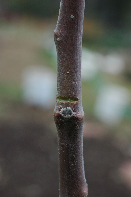 Yes, if you get trees from nursery with a little number of branches (feathers), you can use notching to induce branching. This is mainly important for trees intended for high-density training systems (e.g. tall spindle) and to avoid or reduce the chances of blind wood. Younger trees are more responsive to notching than older trees. You can use a hacksaw or a small knife to cause a notch above the bud as shown in the image attached. In notching, we remove a very small piece of bark without hurting/damaging the wood. This promotes branching by disturbing the hormone (auxin) that prevents the formation of lateral shoots. You should mainly target the area between 30-60 inches above the soil surface for notching. Although you can start notching directly after planting, waiting until new shoots are between 1-3 inches long would be better as you can easily distinguish the buds that failed to break.