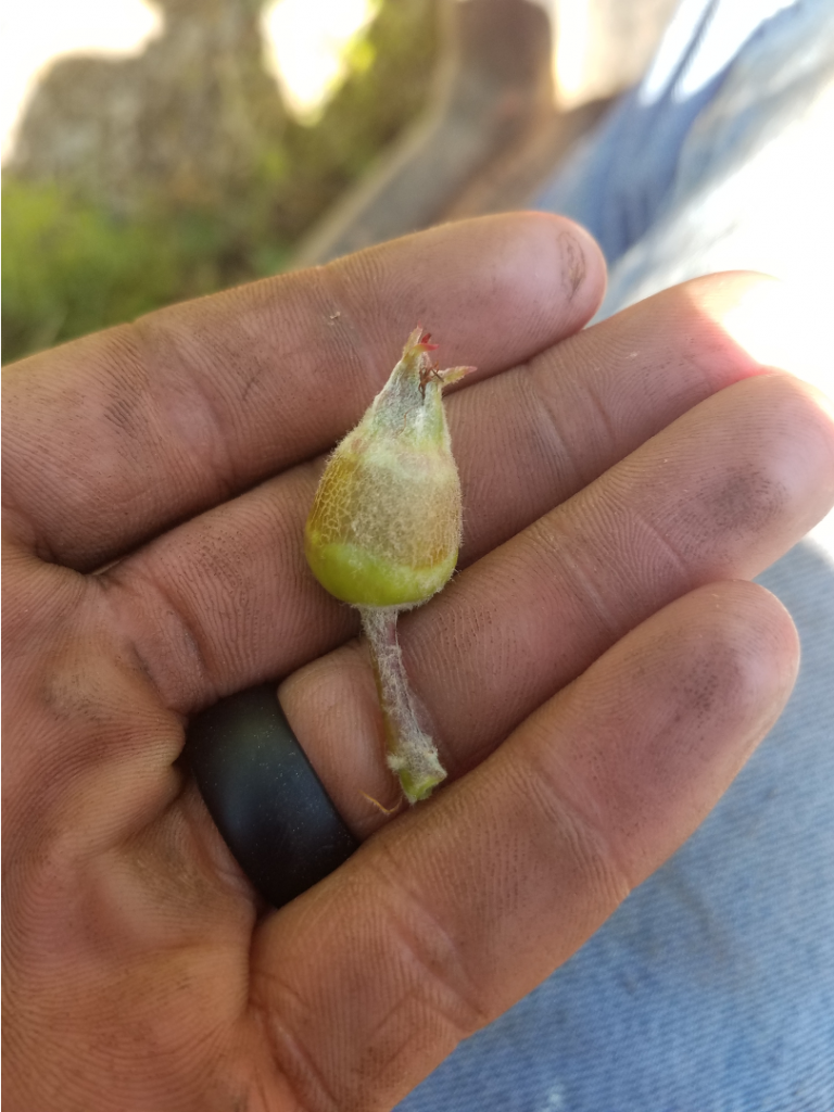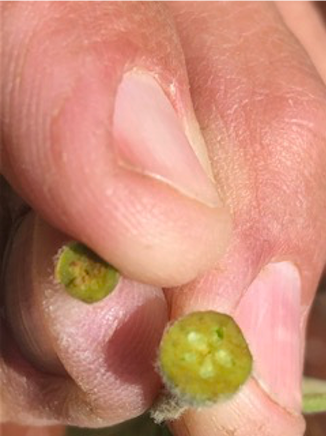 Subfreezing temperatures as low as 30 oF is expected midnight tonight (Friday) to 10:00 am Saturday for northwest and western Virginia. Our cherries, peaches, and most, if not all, apple varieties are at the post-bloom stage now. The critical temperatures that can cause 10% and 90% of damage at this stage are 28 oF and 25 oF, respectively. At this stage of apple crop development, frost can cause damage to the fruits and seeds. Fruits with damaged and aborted seeds stop growing and eventually drop off. Therefore, it’s important to assess your crop first for any frost injury before starting thinning applications this coming week. You can do so by picking a few fruitless from different locations in the orchard and cut them in half by a pocket knife and observe the flesh and seed color. Damaged fruitlets will show brownish flesh and seed color. In most cases, the damage can also be observed on the fruit surface as a frost ring (See images below).