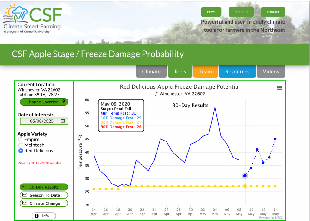 The model predicts apple freeze damage potential for the Red Delicious apples in Winchester, VA, at petal fall. However, the date presented in the chart are also suitable for other apple varieties. The yellow horizontal line indicates that temperature at which 50% of fruits can be killed. The blue color refers to the mini temp forecasted, which is 31 oF for Saturday, May 9.