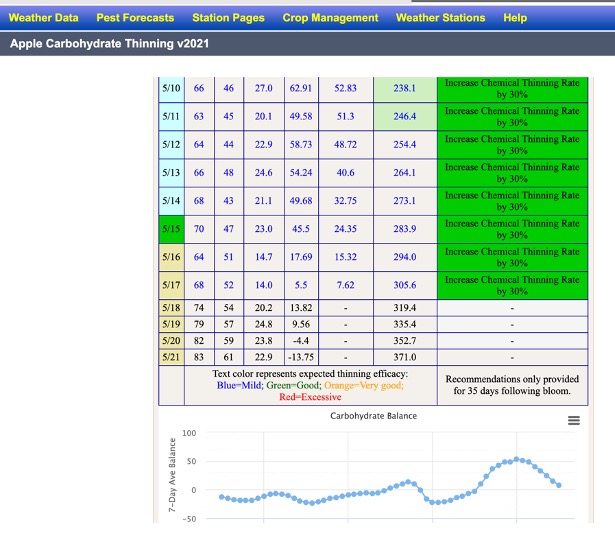 If, after assessing thinning responses in your orchard, you still feel that another thinning application is required, it’s still possible to apply 6-BA and NAA applications until your average fruit sizes are ~ 18 mm. NAA would likely result in better thinning responses at this stage. As shown in the figure below, the carbohydrate model predicts carbohydrate surplus in the next three days and therefore the recommendations are to increase the rate of thinning materials by 30%.