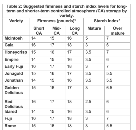 DA readings refer to the level of chlorophyll (green color) in the fruit, just below the skin. As the fruit ripens, chlorophyll levels decline. Therefore, low DA values are indication of fruit maturity. Starch index, fruit firmness, and, to some degree, Brix values are commonly used to determine the harvest date for most commercial apple varieties. Generally speaking, fruits intended for CA should be picked at starch index (3-5), firmness (> 16 lb), and DA reading (around 0.60). Apples intended for fresh consumption should be harvested at starch index (5.5-7), firmness (13-16 lb), DA reading (0.35), and Brix (12-14%).