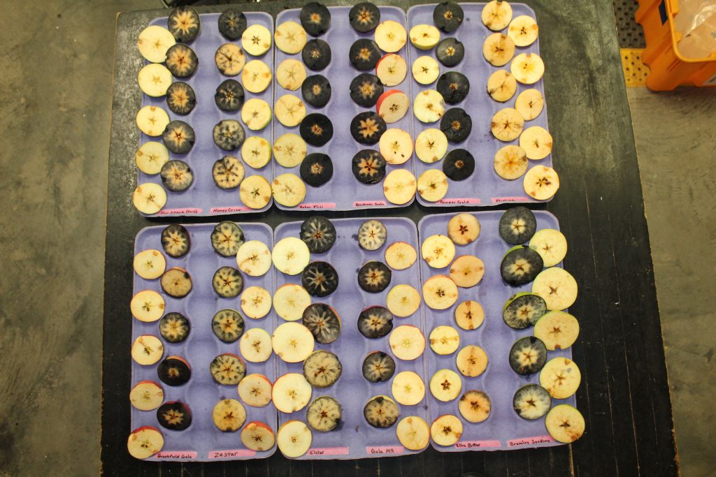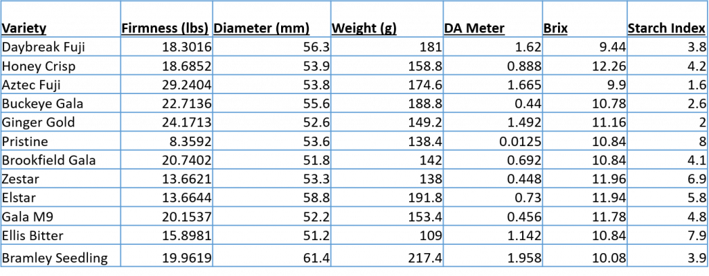 Below is the apple maturity report for the Winchester/Fredrick county area (Table 1). We measured fruit firmness (lb), fruit color, total soluble solids (Brix), and starch conversion rate (1-8 index) for 12 apple cultivars grown in the AHS Jr. AREC’s and we will keep sending similar reports throughout the harvest season to help you determine the optimal harvest time for your apple varieties. More varieties will be added to the table below as we move through the harvest season. We have assessed fruit firmness, Brix, and starch index according to the methods we described previously in another blog post (https://treefruithorticulturevaes.wp.prod.es.cloud.vt.edu/2012/08/23/harvest-maturity-resources/). We used a DA meter to measure fruit coloration. The DA device measures the chlorophyll content in the fruit, just below the skin. As the fruit ripens, chlorophyll degrades, and DA readings decline accordingly. Starch index, fruit firmness and, ‘to some degree’, Brix values, are used either alone or in combination to determine the harvest date for most commercial apple varieties. In Table 2, you will find the estimated firmness and starch index values at which apples should be harvested for controlled atmosphere (CA) storage and fresh consumption. If you don’t see your variety in the list, you can generally harvest your crop at starch index (3-5), firmness (> 16 lb), and DA reading (0.60) for CA storage. But if the crop is intended for fresh market, then wait until starch index of (5.5-7), firmness (13-16 lb), DA reading (0.35) and Brix (12-14%). Again, there are varietal differences, so it’s always recommended to use more than one maturity index to determine the optimal harvest time.