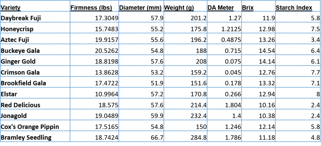 DA readings refer to the level of chlorophyll (green color) in the fruit, just below the skin. As the fruit ripens, chlorophyll levels decline. Therefore, low DA values are indication of advanced fruit maturity. Starch index, fruit firmness, and, to some degree, Brix values are commonly used to determine the harvest date for most commercial apple varieties. Generally speaking, fruits intended for CA should be picked at starch index (3-5), firmness (> 16 lb), and DA reading (around 0.60). Fruits intended for fresh consumption should be harvested at starch index (5.5-7), firmness (13-16 lb), DA reading (0.35), and Brix (12-14%).