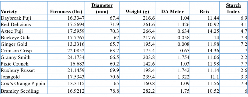 DA readings refer to the level of chlorophyll (green color) in the fruit, just below the skin. As the fruit ripens, chlorophyll levels decline. Therefore, low DA values are indication of advanced fruit maturity. Starch index, fruit firmness, and, to some degree, Brix values are commonly used to determine the harvest date for most commercial apple varieties. Generally speaking, fruits intended for CA should be picked at starch index (3-5), firmness (> 16 lb), and DA reading (around 0.60). Fruits intended for fresh consumption should be harvested at starch index (5.5-7), firmness (13-16 lb), DA reading (0.35), and Brix (12-14%).