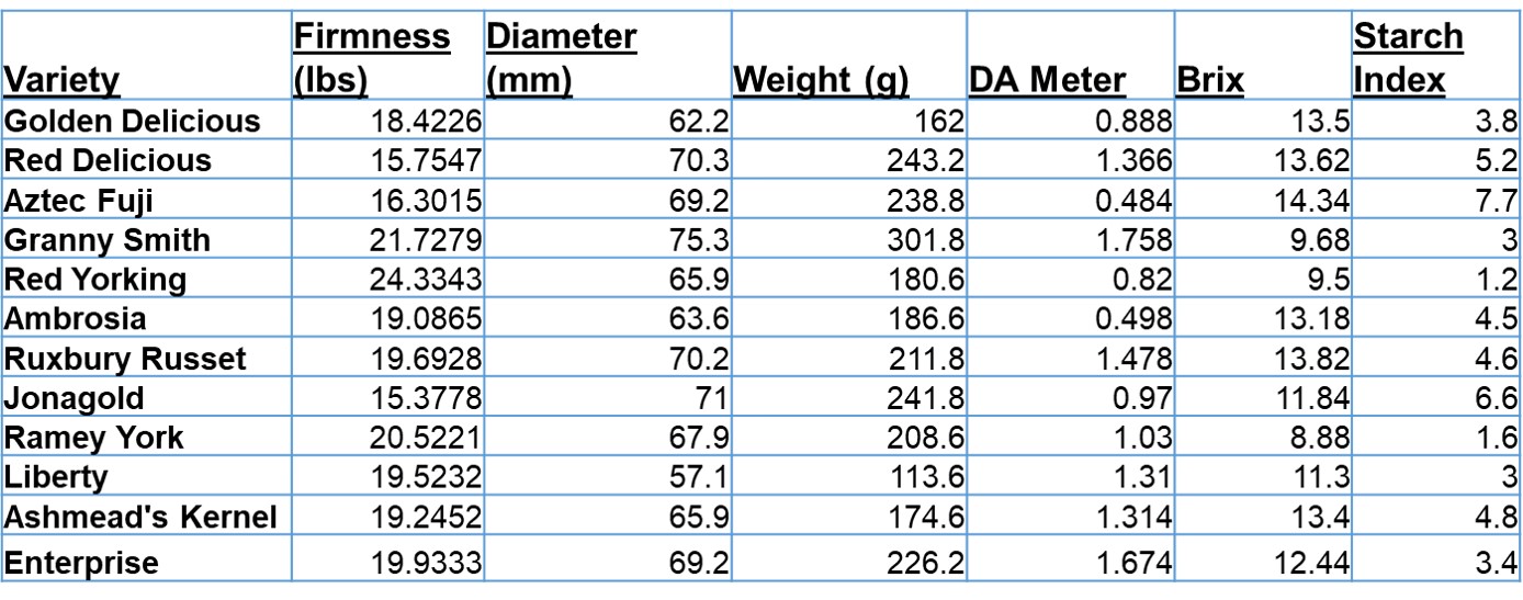 DA readings refer to the level of chlorophyll (green color) in the fruit, just below the skin. As the fruit ripens, chlorophyll levels decline. Therefore, low DA values are indication of advanced fruit maturity. Starch index, fruit firmness, and, to some degree, Brix values are commonly used to determine the harvest date for most commercial apple varieties. Generally speaking, fruits intended for CA should be picked at starch index (3-5), firmness (> 16 lb), and DA reading (around 0.60). Fruits intended for fresh consumption should be harvested at starch index (5.5-7), firmness (13-16 lb), DA reading (0.35), and Brix (12-14%).
