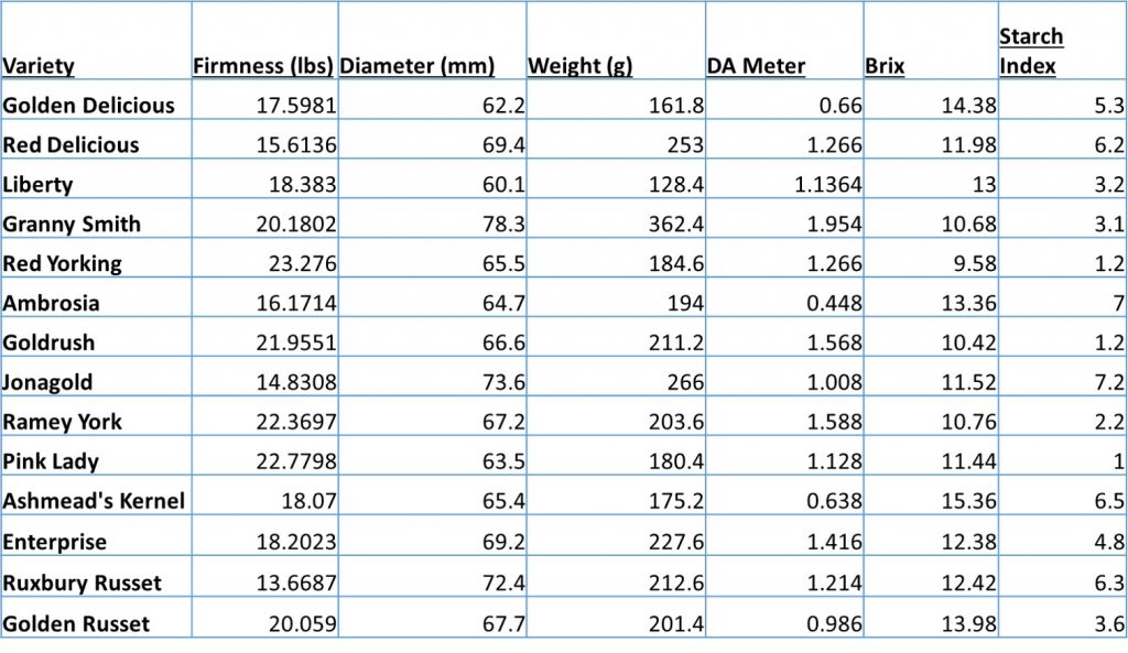 DA readings refer to the level of chlorophyll (green color) in the fruit, just below the skin. DA values decrease proportionally with fruit ripening. Starch index, fruit firmness, and, to some degree, Brix values are commonly used to determine the harvest date for most commercial apple varieties. Generally speaking, fruits intended for CA should be picked at starch index (3-5), firmness (> 16 lb), and DA reading (around 0.60). Fruits intended for fresh consumption should be harvested at starch index (5.5-7), firmness (13-16 lb), DA reading (0.35), and Brix (12-14%).