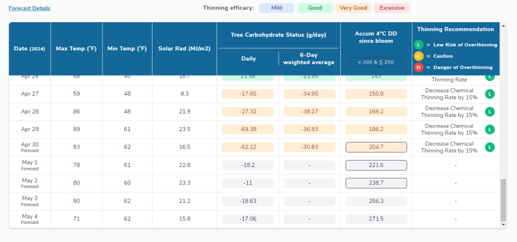 With the high daily temperatures we’re experiencing this week, the degree days for Gala and most other apple cultivars in the Winchester/Frederick County area will likely reach the 200DD mark today. This signals the optimal timing for chemical fruit thinning using 6-BA-carbaryl and NAA-carbaryl mixes. I utilized the carbohydrate thinning model on NEWA (https://newa.cornell.edu/apple-carbohydrate-thinning), based on a green tip date of March 7 and full bloom date of April 14 for Gala in my location. The model indicates a severe carbohydrate deficiency, which is very conducive to thinning conditions. It also recommends reducing the chemical thinning materials by 15% compared to standard rates. Please refer to my previous posts ((https://treefruithorticulturevaes.wp.prod.es.cloud.vt.edu/2024/04/18/apple-fruit-thinning-general-notes-and-specific-recommendations-for-central-virginia/) for the standard rates I’ve recommended and adjust your calculations accordingly. You have a four-day window (April 30 to May 3) to complete your thinning applications. The temperatures over the next few days are expected to be above 80 degrees Fahrenheit, which is ideal for both the uptake and activity of 6-BA and NAA products.