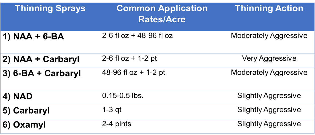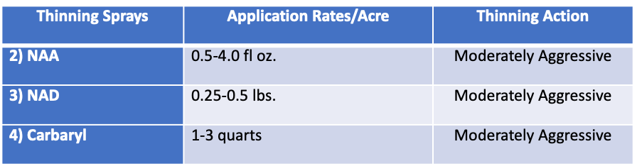 Application rates mentioned in this article are based upon a concentrate spray volume of 100 gallons per acre and product labels at the time of publication. When applying chemical thinners use the rates indicated on the labels of the products that you are using. The degree of thinning action are listed according to the author’s personal field experiences. The degree of thinning action may vary from orchard to orchard and block to block.