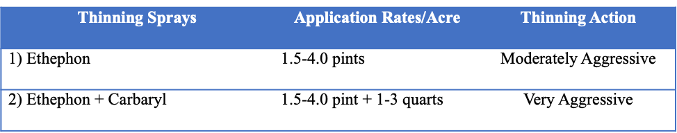 • When aggressive thinning is needed, mix carbaryl or NAA with ethephon.