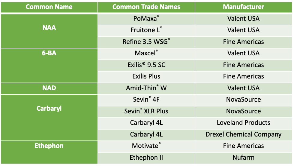 Table 1: Common chemical thinners, tradenames, and manufacturers.