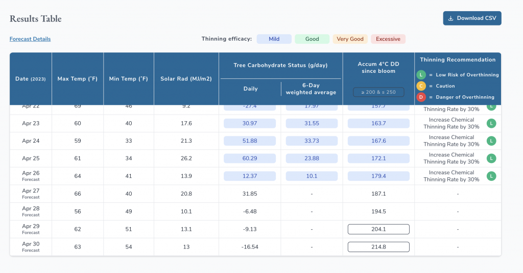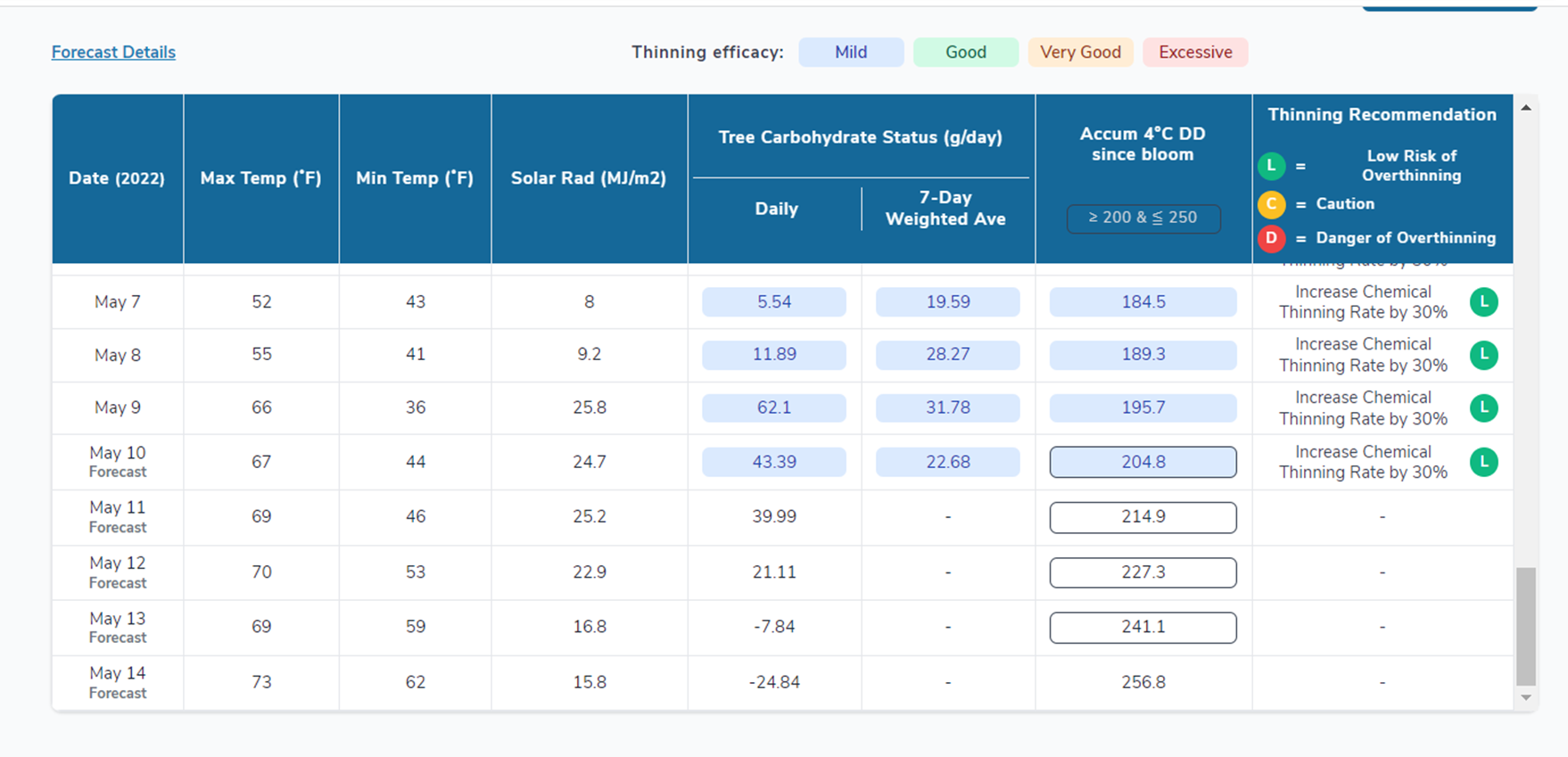 However, the model also indicates a carbohydrate surplus from April 26 through at least the next three days. As a result, it recommends increasing the thinning material rate by 30% above standard. You can find these suggested rates in the last column of the table below. Under surplus conditions, the risk of over-thinning or excessive natural fruit drop is reduced. Still, conditions may shift by Tuesday or Wednesday, so rate adjustments might be necessary.