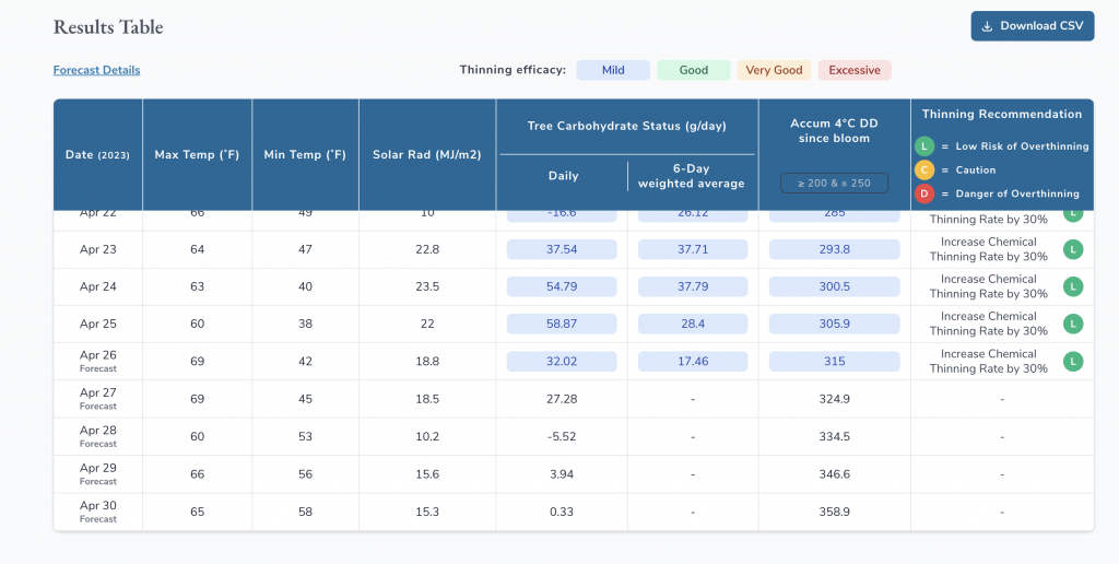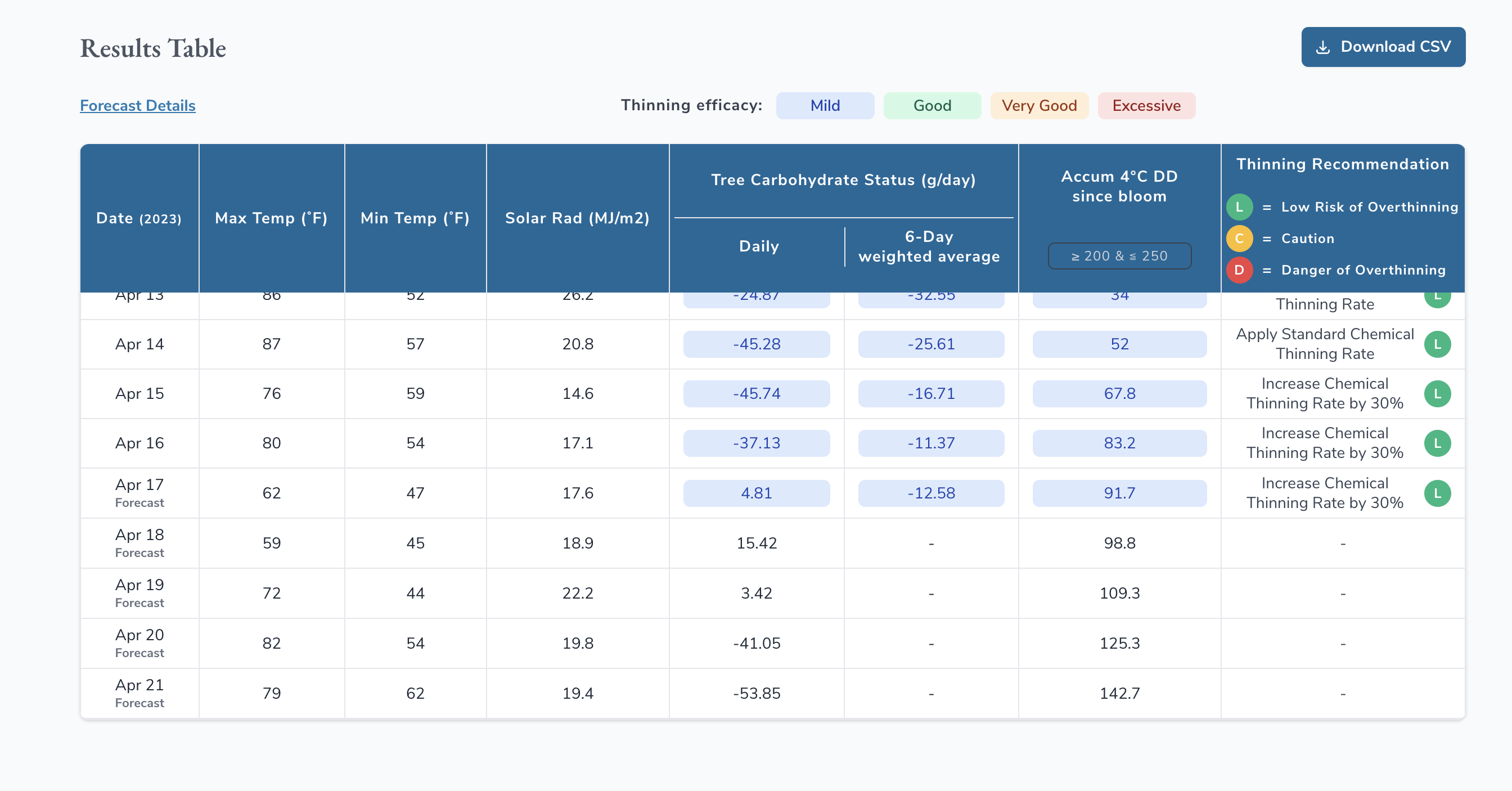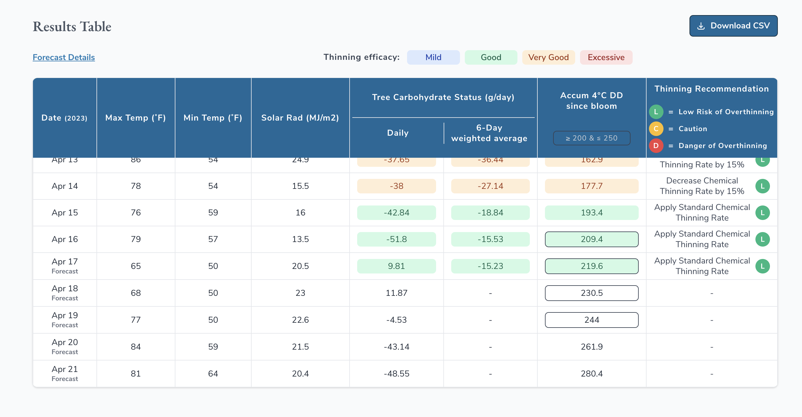 Importantly, the model does not rely on a single day’s data. Instead, it calculates a six-day weighted average of carbohydrate balance to determine whether the tree is in a state of surplus or deficit. This running average guides decisions on whether thinning materials should be applied, what kind of response to expect, and how much product to use to avoid over- or under-thinning. You can refer to Column 6 in the table below to view the six-day average.