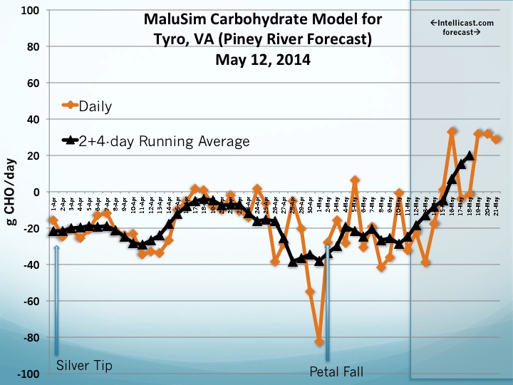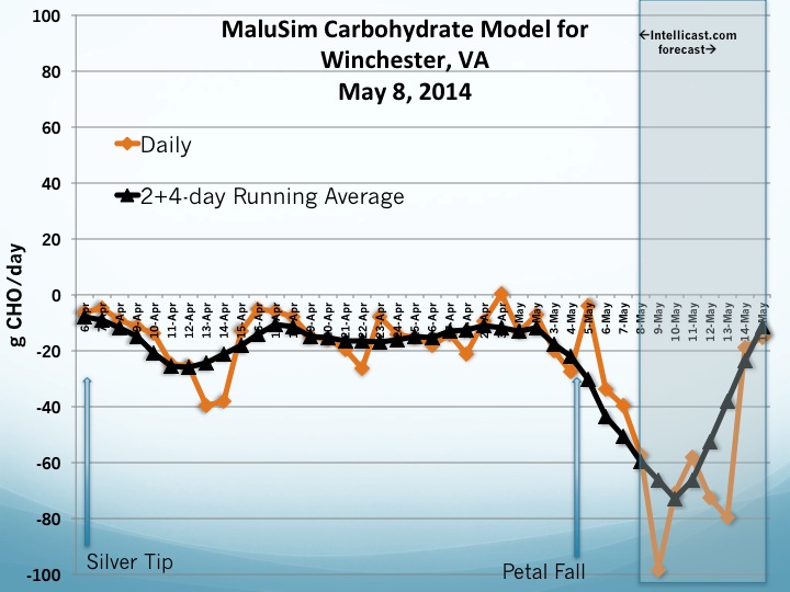For the Central Virginia region, I’ve run a recap of the season using weather station data through Monday, May 19. Growers should compare their thinning results to the carbohydrate status at the time they made their application to see how well the model predicted the potency of thinners this year. From my experience, using the MaluSim model as a forensic tool can really help explain why chemical thinners work so differently from one year to the next. As I repeatedly have said, the most difficult part of using the MaluSim model to make real time decisions is having accurate weather data to use as inputs. As I mention above, cloud cover can really impact the carbohydrate status in the tree, and thus the responsiveness of thinners, but it is the hardest variable to forecast. Additionally, weather can be very local. We experienced this issue with the major differences between Tyro and Piney River weather forecasts. We also saw a lot of variable temperature data, with several days between May 8 and 14 being 5 or more degrees Fahrenheit warmer than forecast.