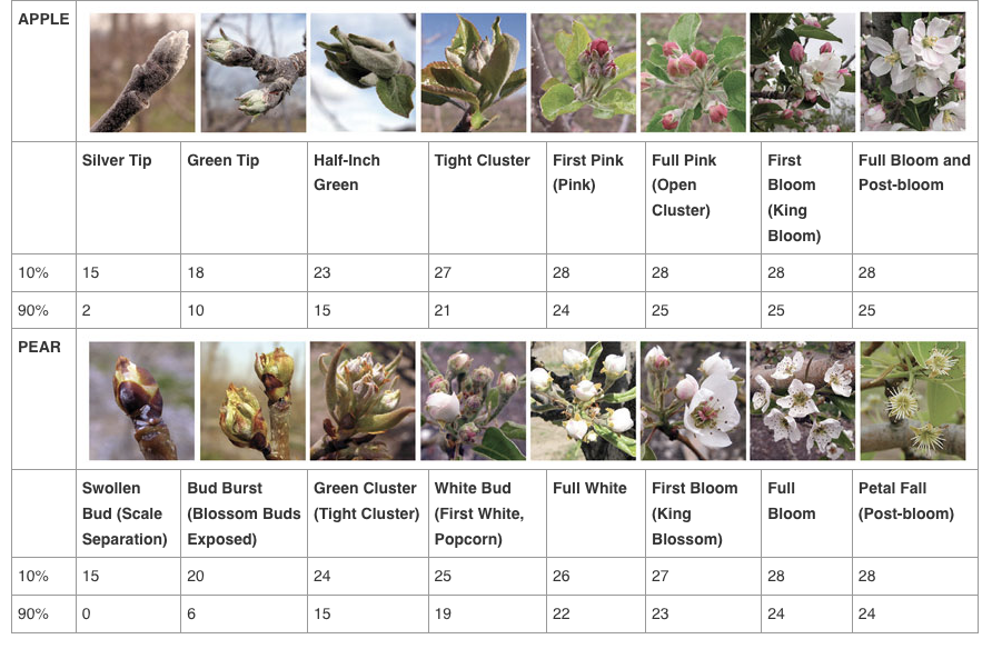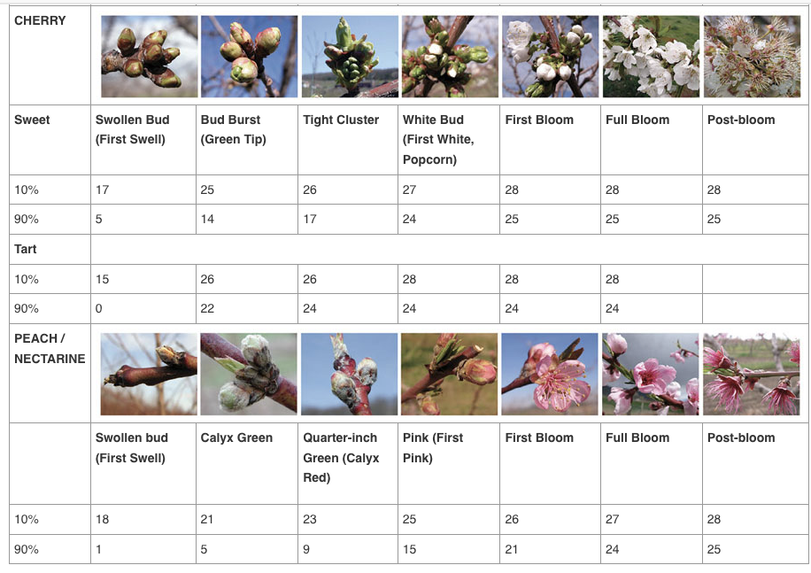Based on the weather forecast for Tuesday, March 29, temperatures will drop to 19 oF for a couple of hours (6:00 – 8:00 am) in the Frederick County and Rappahannock-Madison area, which could be devastating for the majority of apple cultivars and some early-bloom peach cultivars grown in these locations. Our apple cultivars in Winchester are currently in the tight-cluster stage, and some (e.g. Pink Lady and Zestar) are in the full pink-stage now. The majority of peach cultivars are in the pink stage now, with some early-blooming cultivars (e.g. John Boy) are already in bloom. Sweet cherries, on the other hand, are still in tight-cluster stage. Based on the critical temperature tables below, 90% of apple buds at tight-cluster can be killed if exposed to temperatures at 21oF and below for more than 30 min. Similarly, peach flowers at full bloom can be killed at the temperatures forecasted for Tuesday. Sweet cherry cultivars that are still in tight cluster will be likely OK, and only 10% can be damaged by this freeze event.
