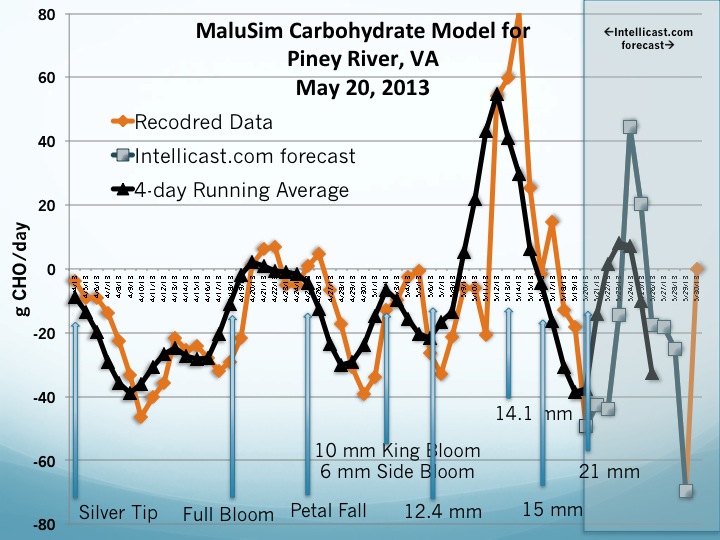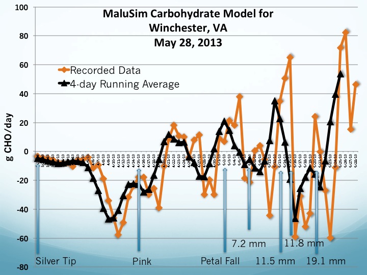 On May 20, I ran the MaluSim carbohydrate model for Winchester and Central Virginia. This will be the last MaluSim posting using forecasted data for the season. Sometime in the week or two I will post a season recap using only recorded data.