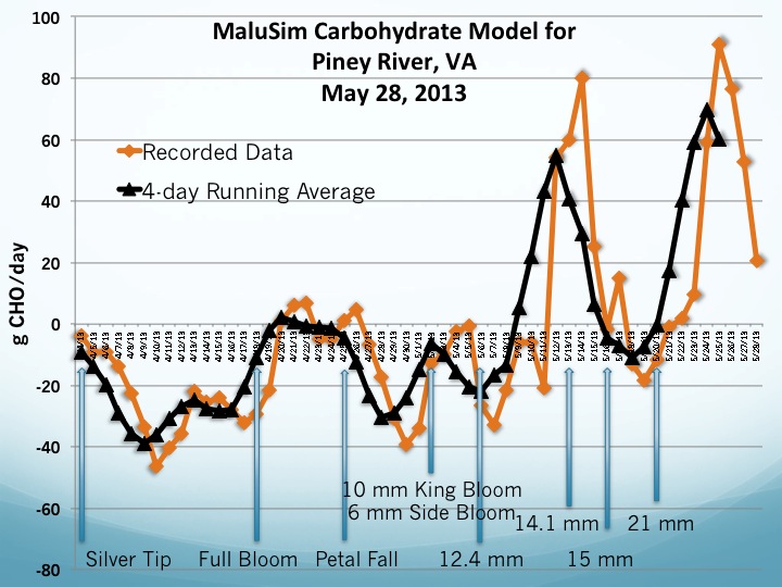 As I spoke about at the Winchester breakfast meeting on Thursday morning, the Winchester forecast is calling for warm and cloudy weather starting today and running through most of next week. From many year’s of research, we know that these are the conditions under which there is a fair amount of natural thinning and that chemical thinners can be particularly active. When the weather data is run through the MaluSim model, we see that there is a carbohydrate deficit between -40 to -60 g CHO/day predicted for the next 10 days. This means that chemical thinners that are applied over the next several days will likely be fairly active. With this in mind, growers should consider reducing rates and/or not using a surfactant. Growers with blocks that sustained freeze damage on Tuesday morning, should consider further reducing rates. As always, you should be checking your trees and making decisions based upon the conditions in your own orchard.