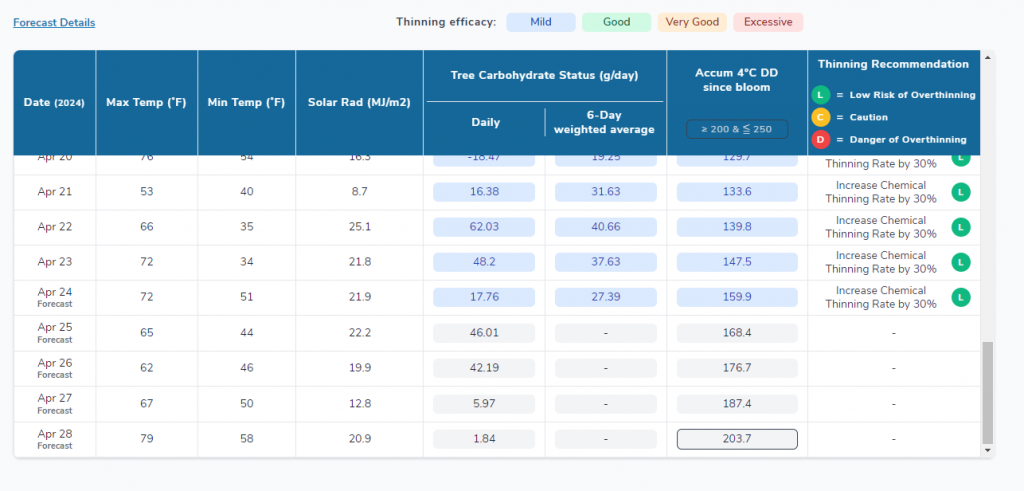However, the model also indicates a carbohydrate surplus from April 26 through at least the next three days. As a result, it recommends increasing the thinning material rate by 30% above standard. You can find these suggested rates in the last column of the table below. Under surplus conditions, the risk of over-thinning or excessive natural fruit drop is reduced. Still, conditions may shift by Tuesday or Wednesday, so rate adjustments might be necessary.